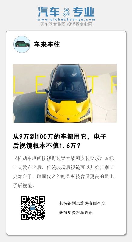 其实不是,我们不应当怀疑技术的创新性,也不能否定传统零部件的可靠性。电子后视镜的优点不少,主要集中在视野宽泛、全天候能力强、夜视能力好。我们现在所使用的外后视镜,已经有了100多年的历史,唯一的优点,就是可靠性极强(结构简单确实不爱坏),但技术改进上也仅有“防眩光”这一项算是比较具有代表性的改进。