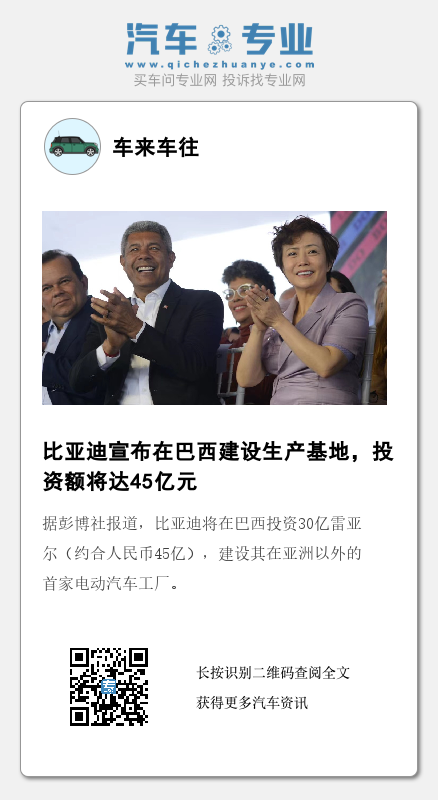 据彭博社报道,比亚迪将在巴西投资30亿雷亚尔(约合人民币45亿),建设其在亚洲以外的首家电动汽车工厂。