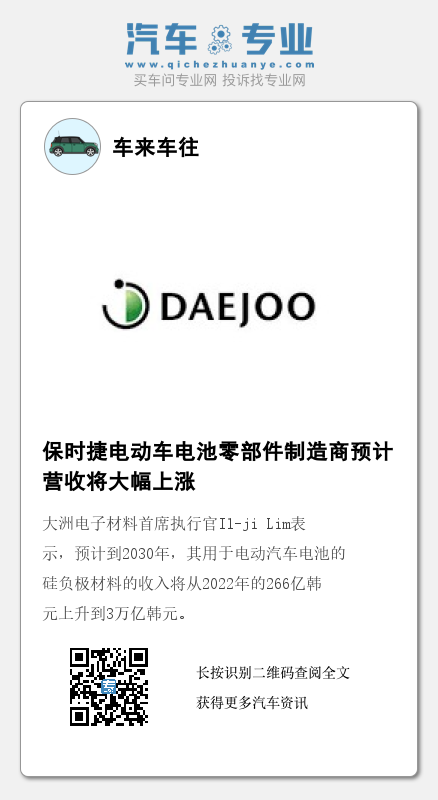 大洲电子材料(Daejoo Electronic Materials)首席执行官Il-ji Lim表示,预计到2030年,其用于电动汽车电池的硅负极材料的收入将从2022年的266亿韩元上升到3万亿韩元(合23亿美元),届时这部分业务营收将占其总营收的至少90%,高于去年的15%。