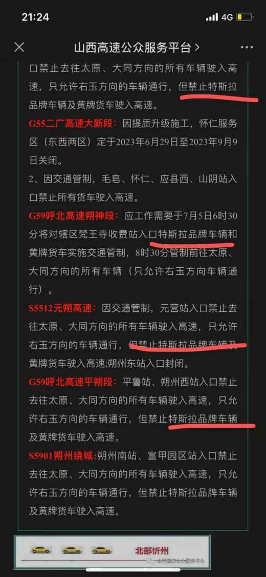 7月5日,有网友发现“山西高速公众服务平台”发布的山西高速实时路况信息中,部分路段禁止特斯拉品牌车辆驶入高速,或在高速入口对特斯拉品牌车辆实施交通管制。根据网传截图显示,G59呼北高速朔神段、S5512元朔高速、G59呼北高速、S5901朔州绕城等高速路段收费站入口,因工作需要或交通管制,清晰写明了禁止特斯拉品牌车辆进入。有网友认为,这是山西高速在“屏蔽”特斯拉。