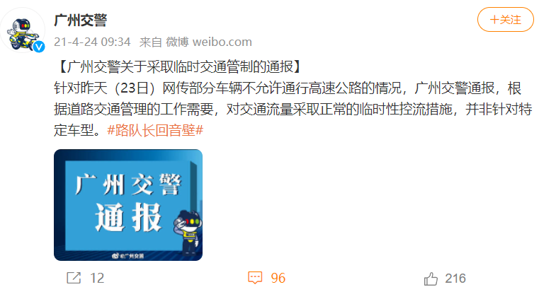 值得一提的是,这并不是特斯拉第一次被禁止上高速了。2021年4月23日,曾有网友视频报料称,当天广州南沙港快速交通管制大货车和特斯拉,从视频中可以看出,至少有多辆特斯拉,疑似被路管人员拦停,并且车辆停放在路边。随后,广州交警针对此事发出通报称,不允许部分车辆通行高速公路只是根据道路交通管理的工作需要,对交通流量采取正常的临时性控流措施,并非针对特定车型。