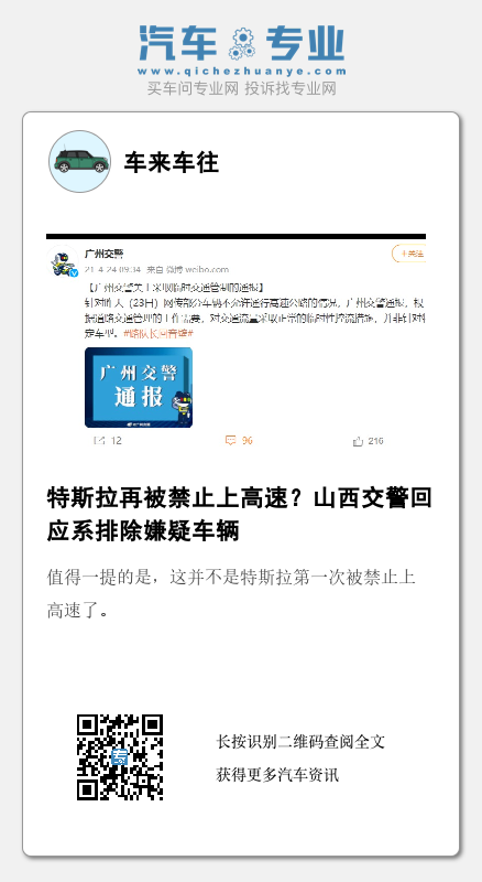 与此同时,社交平台上一位自称是山西高速交警的网友称,负责任地说,没有接到过任何禁止禁止特斯拉驶入高速公路的通知或者命令,经询问其他支队,系临时性管制,主要是要做一些排查工作,希望大家不要瞎猜,分时段、分车型管制是很正常的。