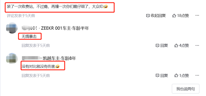 同样是发生碰撞,极氪以130km/h的速度撞向钢柱,车损未侵入座舱、人没事,大众以不到一半的速度导致车毁人亡。不少网友最后得出结论,极氪001的安全品质极高。