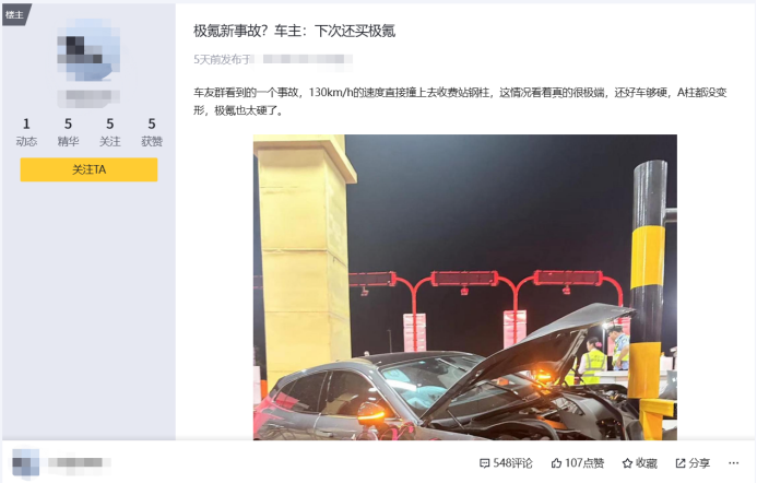 51君观察到,这位博主的账号仅仅创立1周左右,但发布的第一条帖子也是唯一一条帖子,就是描述极氪001在高速收费站“耐撞”的事件,并隐藏了车主对事件的完整描述。