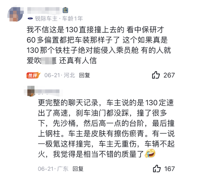 也许是意识到自己的言辞太过夸张,事后该车主又补充到,“撞了很多下,先沙桶,然后高一点的台阶,最后撞上钢柱。”但不论是否有缓冲,如果起碰速度130km/h速度下的车祸,结果绝不可能是轻描淡写的“轻伤”。