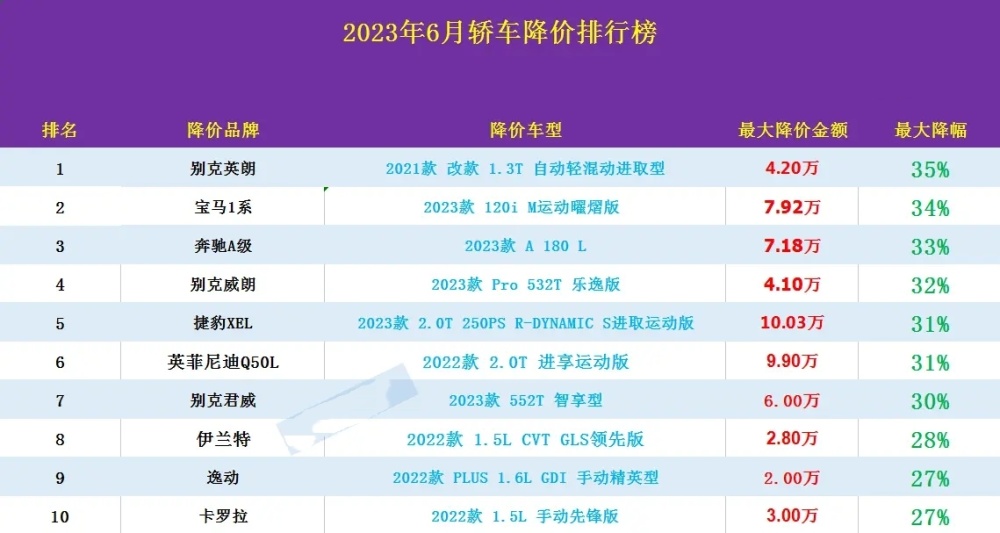根据统计的6月份降价排行榜单,这一波的降价怎么看起来比当初12万买东风雪铁龙C6还要更夸张呢?在在2023年6月轿车降价排行榜单的前30名中,光是降幅在30%的车型就有7款,其中有四款车型的现金优惠金额更是高达10万左右。