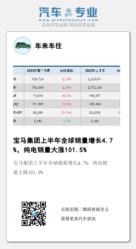 2023年上半年,宝马集团全球累计销量攀升至1,214,864辆,同比增长4.7%。其中,宝马集团累计交付了152,936辆宝马和MINI纯电动汽车,同比大涨101.5%。
