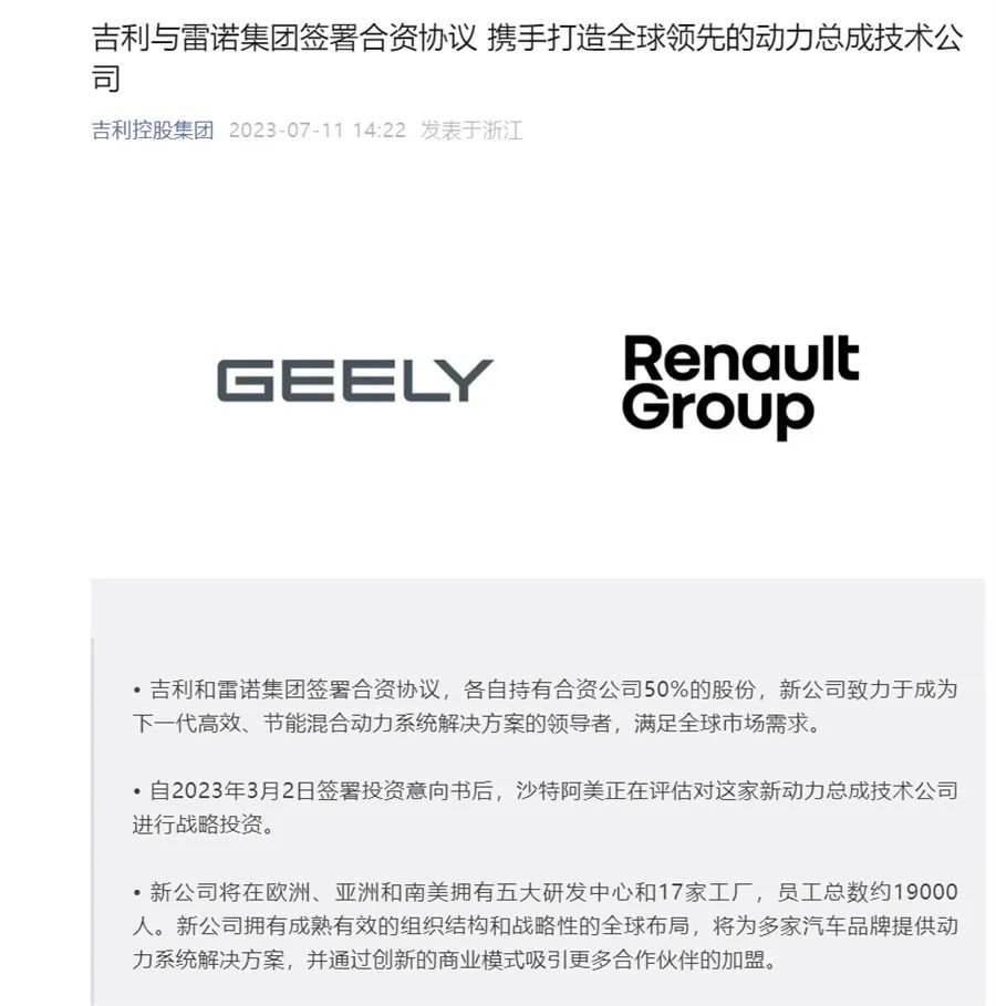 【文/财圈社&道哥说车 听风吟】7月11日,吉利汽车控股公司发布公告称,吉利控股集团和吉利汽车控股公司与雷诺集团签署合资协议,成立一家专注于混合动力和燃油动力总成的合资公司。据公告内容,吉利与雷诺各持有合资公司50%的股份。