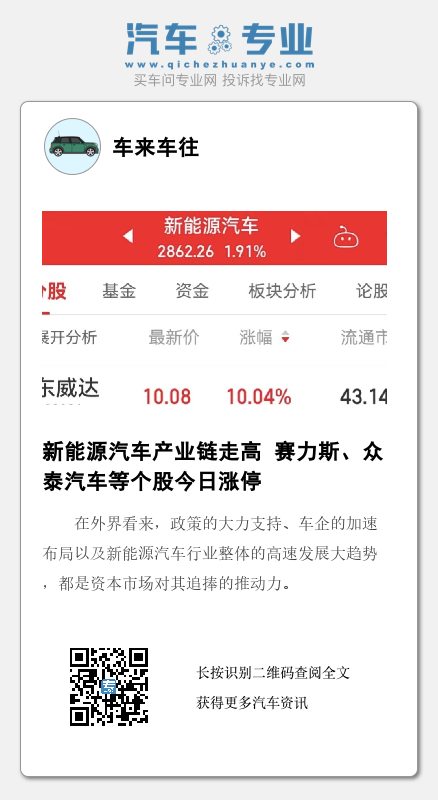 不仅如此,众泰汽车(SZ000980,股价3.41元,市值171.95亿元)、中通客车(SZ000957,股价12.79元,市值75.83亿元)、浙江世宝(SZ002703,股价16.5元,市值100.80亿元)、宁波高发(SH603788,股价15.49元,市值34.55亿元)、山东威达(SZ002026,股价10.08元,44.91亿元)等十余股封板,中集车辆(SZ301039,股价14.68元,市值252.2亿元)大涨9.88%。