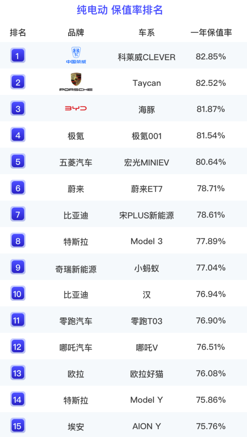 再看前三名之后,极氪001和五菱宏光MINIEV分别位列第四和第五名,一年保值率也都超过了80%,榜单前十名,再之后按排名前后分别是蔚来ET7、比亚迪宋PLUS新能源、