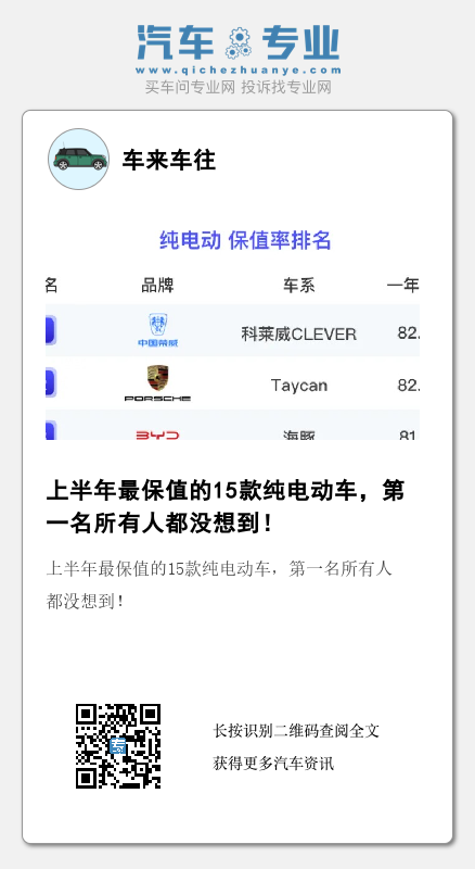 今年上半年的纯电动汽车保值率榜单里,最让人意外的莫过于冠军的归属,也就是上半年最保值的纯电动汽车,竟然是名不见经传的上汽荣威科莱威CLEVER,而且排名超过了保时捷Taycan和比亚迪海豚。