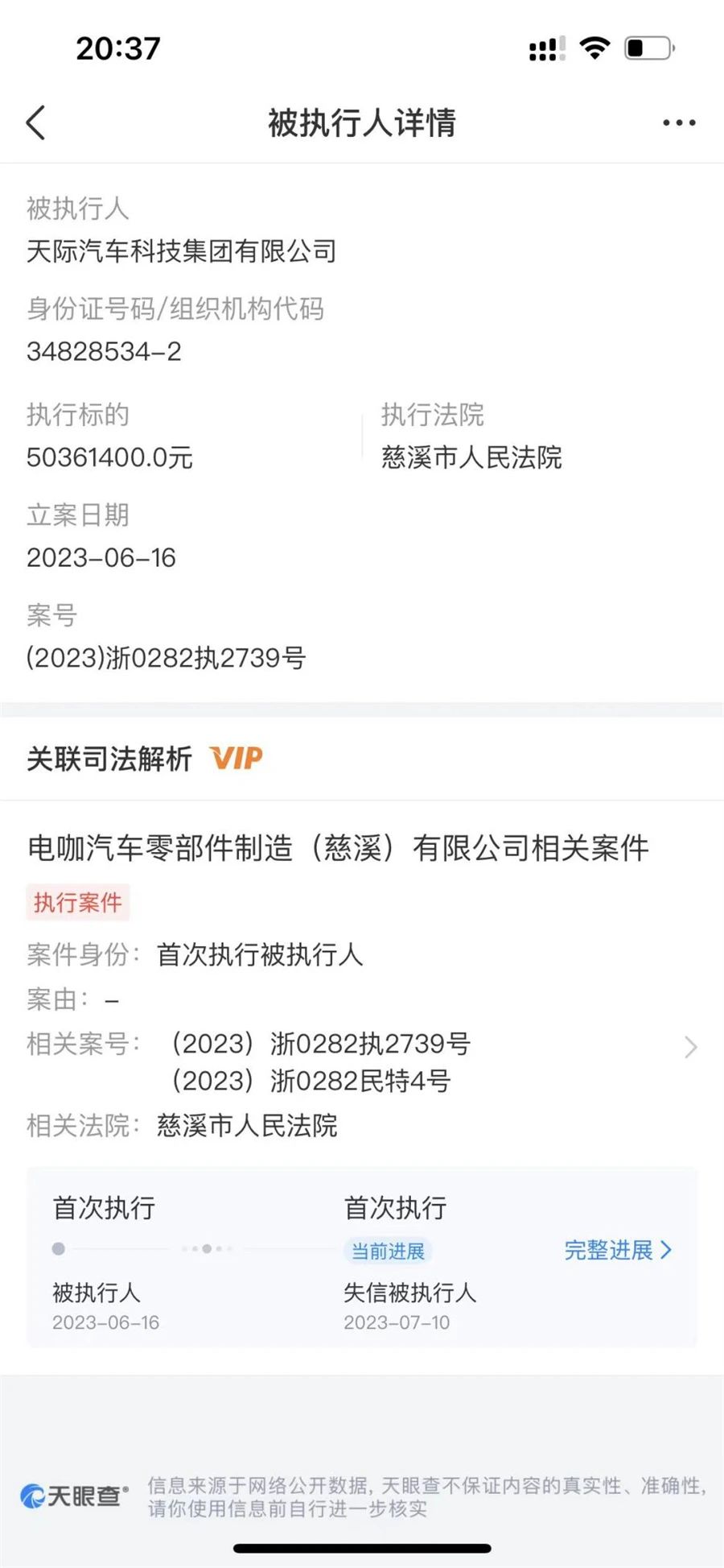 天眼查App显示,天际汽车科技集团有限公司因违反财产报告制度,被慈溪市人民法院列为失信被执行人(老赖)。值得一提的是,大概一个月前,这家造车新势力还被东安动力讨债超1600万元,相关资产也被实施财产保全。