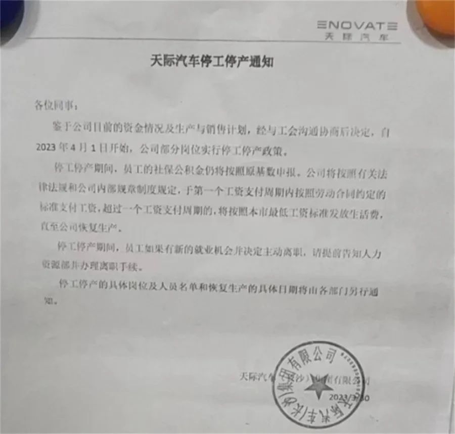 今年3月,天际汽车停工停产的消息出现,一份来自天际汽车的通知显示,鉴于公司目前的资金情况及生产与销售计划,自2023年4月1日开始,公司部分岗位实行停工停产政策。据该文件,停工停产期间,员工的社保仍按照原基数申报。在第一个支付周期后,公司将按照当地最低工资标准为员工发放生活费,直至公司恢复生产。