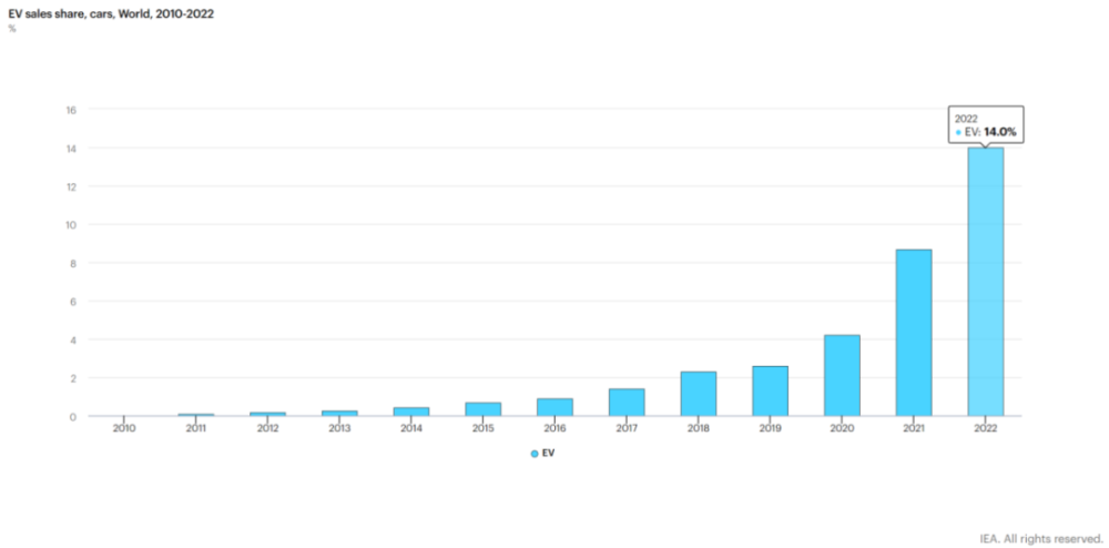 当下全球电动车发展迅猛。国际能源署数据显示,2022年全球新能源车销量超1,000万台,每卖出100台新车,其中就有14台是新能源车。相较于2021年9%和2020年5%的市场份额,渗透率呈现指数级增长。
