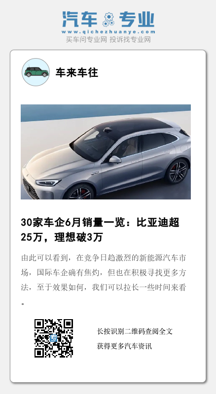 比亚迪之外,长安系自主品牌6月拿下了185,255辆的月销,同比增长16.42%,前6月累销已突破100万;奇瑞汽车6月销量105,908辆,同比增长33.4%,前6月销量达到539,427辆,同比上涨超五成;吉利汽车与长城汽车6月销量也都超过了10万辆,同环比双双上涨。