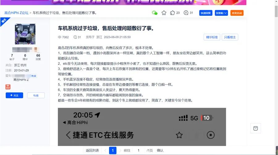 而无论是“虚假宣传”还是“侵害隐私”对于品牌形象来说都相当于无可挽回的损失。除此之外,在论坛等渠道,也偶有高合汽车车主吐槽车辆的质量问题。《道哥说车》编辑注意到,在汽车之家的论坛中,有高合HiPhi Z车主以“车机系统过于垃圾,售后处理问题敷衍了事”为题,揭露了车辆包括雨刮器、ETC、座椅舒适、手机蓝牙连接不稳定、空调忽冷忽热在内的众多问题,并提到“高合Z(HiPhi Z)的车机系统真的够垃圾,向售后反应了多次,根本不处理”。