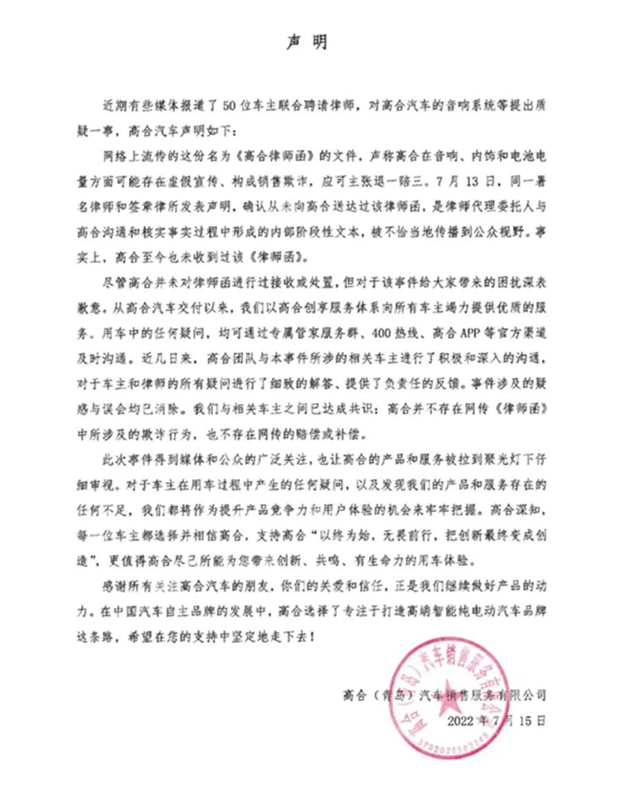 2022年7月,50位车主集中向高合汽车维权,认为高合HiPhi X存在虚假宣传,其中包括音响、内饰材料、电池三个方面: