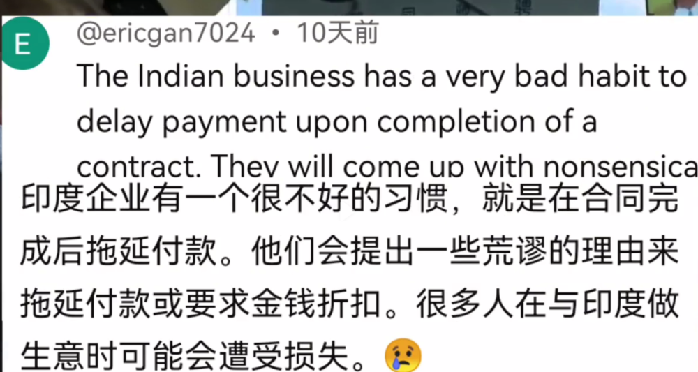 另有海外网友表示,印度企业有一个很不好的习惯,就是在合同完成后拖延付款,他们会提出一些荒谬的理由来拖延付款或要求金钱折扣,很多人在与印度做生意时可能会遭遇损失。