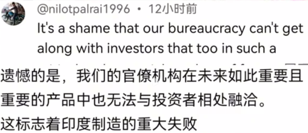 也有印度网友认为,我们的官僚机构在如此重要的产品中也无法与投资者相处融洽,这标志着印度制造的重大失败。