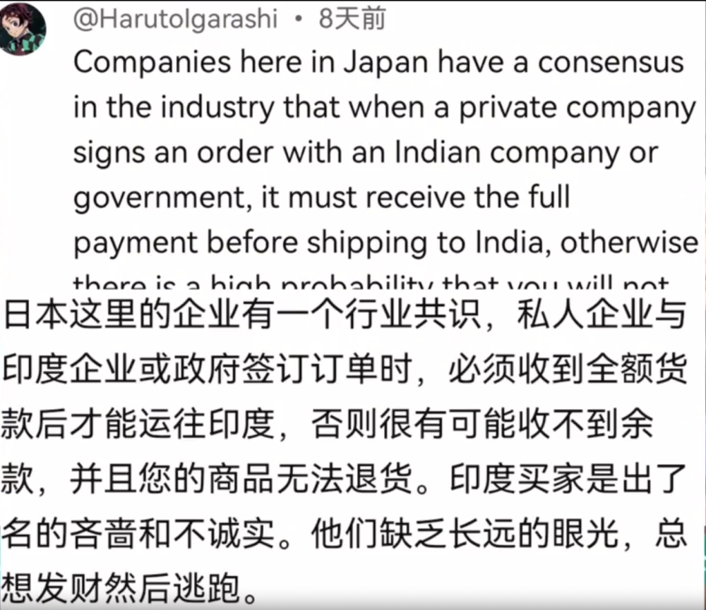 有日本网友指出,日本企业有一个共识就是,私人企业与印度企业或政府签订订单时必须要收到全额货款后才能运往印度,否则有可能收不到余款,并且你的商品无法退货。