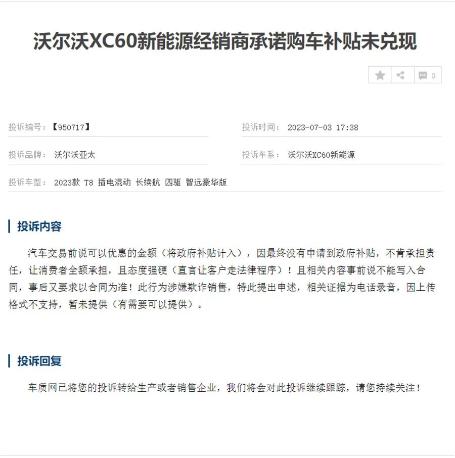 其实翻看投诉列表,像以上案例的故障数不胜数,并且还存在诸如中控/车身异响(共振)、方向盘/座椅调节按键失灵、雨刷器故障等“小”毛病。值得一提的是,有关沃尔沃的投诉还出现了不少服务方面的问题,如新能源购车承诺未兑现。一位2023款T8插电混动长续航四驱智远豪华版沃尔沃X60车主在投诉中表示,“汽车交易前说可以优惠的金额(将ZF补贴计入),因最终没有申请到ZF补贴,不肯承担责任,让消费者全额承担,且态度强硬(直言让客户走法律程序)!且相关内容事前说不能写入合同,事后又要求以合同为准!”