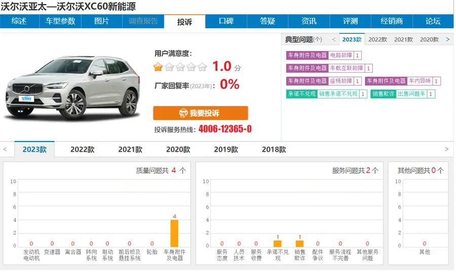 这样的沃尔沃,即便推出了全新的EX90,又是否能让消费者信任呢?更离谱的是,以上所有投诉,沃尔沃权当没看见,论对消费者的冷漠,沃尔沃认第二可能没有人敢任第一。据车质网数据,沃尔沃最畅销的XC60,仅2023款质量问题就达到了60个,然而它的厂家回复率居然是0.6%。而沃尔沃X60新能源(Recharge),厂家回复投诉率则是0%。作为对比,凯迪拉克CT5的投诉回复率是100%。这么看,也不是所有的豪华品牌都高高在上啊。