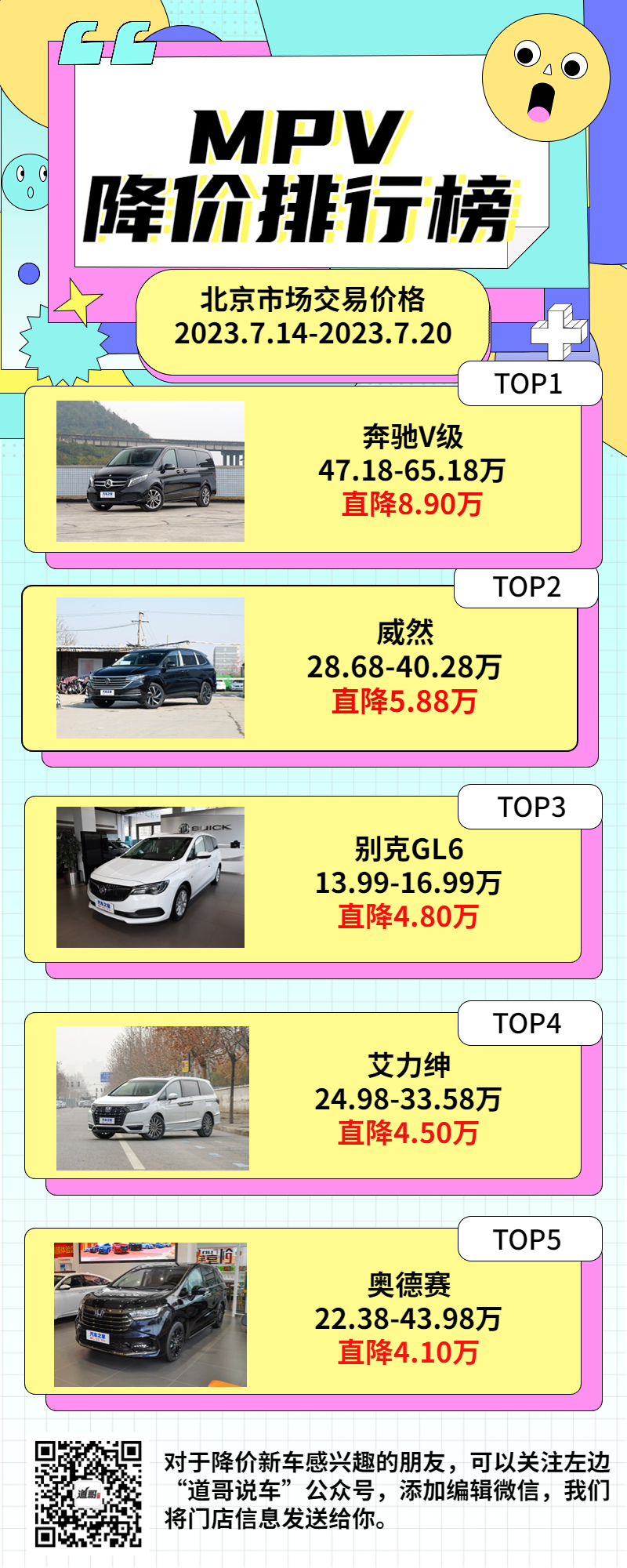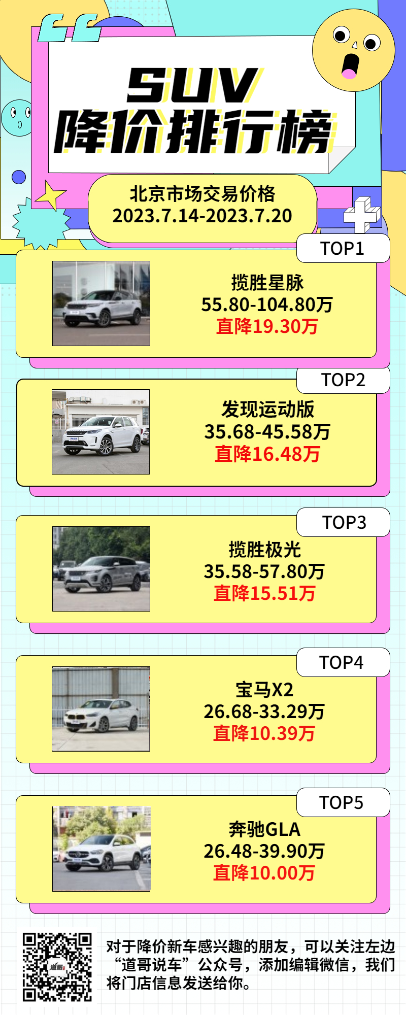 紧凑型车方面,除了奔驰A级较上周多优惠了5百元,其余几款车型与上周相比没有什么变化;SUV方面,揽胜星脉以直降19.3万元的降幅冲到榜单第一,这周想买这款车的朋友可以重点考虑下,紧随其后的发现运动版较上周多优惠了8千元,揽胜极光则没有上周优惠大了;MPV方面,无论是降价车型排位还是降幅均与上周保持一致。