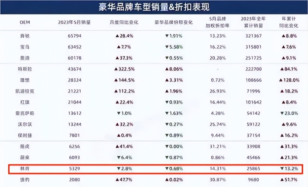 2020年,林肯国产化落地,当年销量劲增32%至6.2万辆。2021年,林肯暴涨48%至9.1万辆,距离10万辆大关仅一步之遥,并首超美国成为全球最大单一市场。一时之间,“林肯现象”成为业内津津乐道的研究话题。可惜从此之后,林肯销量暴涨节奏结束,进入下降通道。2022年,林肯只售出7.93万辆,同比下滑13.4%。今年前五个月,林肯销量为2.58万辆,同比下滑13.2%,是排行榜上除了雷克萨斯之外,下滑幅度最大的主流豪华品牌。