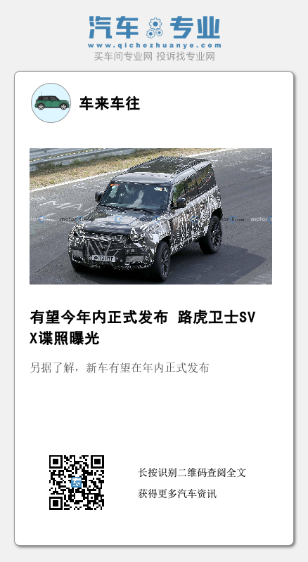 动力方面,新车将搭载来自宝马的4.4T双涡轮增压V8发动机,该发动机在宝马X5 M上的调校为最大功率626马力、最大扭矩750牛·米。不过据悉,路虎卫士SVX预计还将进行重新调校。(消息及谍照来源:motor1.com)
