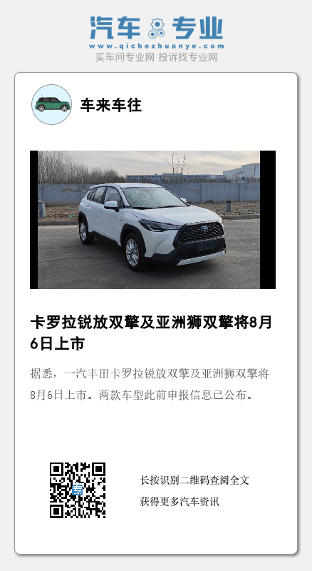 据悉,一汽丰田卡罗拉锐放双擎及亚洲狮双擎将8月6日上市。两款车型此前申报信息已公布。