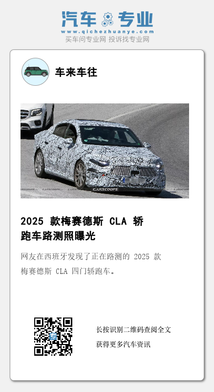 IT之家 7 月 21 日消息,网友在西班牙发现了正在路测的 2025 款梅赛德斯 CLA 四门轿跑车。由于车身贴满了伪装贴纸,目前无法判断其细节,不过从照片来看,前脸配有更宽的格栅进气,两侧的大灯也有所调整。