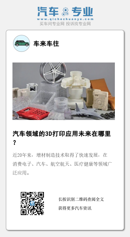 当然,随着技术、材料以及打印速度的进一步突破,在不久的将来3D打印或许可以在汽车汽车领域大有所谓。我国作为世界上最大的汽车产销国之一,3D打印技术在我国汽车制造领域的实际应用将是不可逆的趋势,而业内对于3D打印技术在汽车领域的探讨也将不断深入下去。