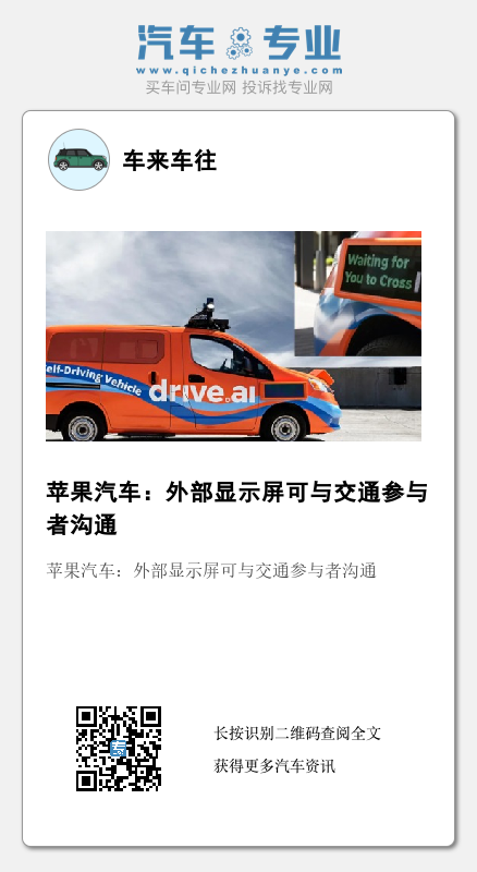 苹果公司于 2019 年收购了一家专门从事自动驾驶技术的初创公司 Drive.ai。Drive.ai 早在 2016 年就开始在其测试车辆上安装外部显示屏,并在 2018 年对其进行了改进。Drive.ai 使用的外部显示屏可以显示诸如“等你过马路”、“靠边停车”、“乘客上下车”等信息。