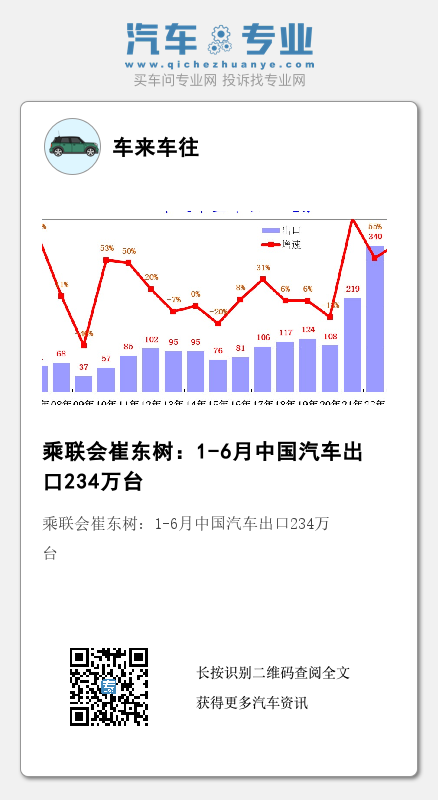IT之家此前报道,中汽协数据显示,6 月我国汽车企业出口 38.2 万辆,环比下降 1.7%,同比增长 53.2%。分车型看,乘用车本月出口 31.2 万辆,环比下降 4.1%,同比增长 57.7%;商用车出口 7 万辆,环比增长 10.7%,同比增长 36%。新能源汽车出口 7.8 万辆,环比下降 28.4%,同比增长 1.7 倍。1-6 月,汽车企业出口 214 万辆,同比增长 75.7%。