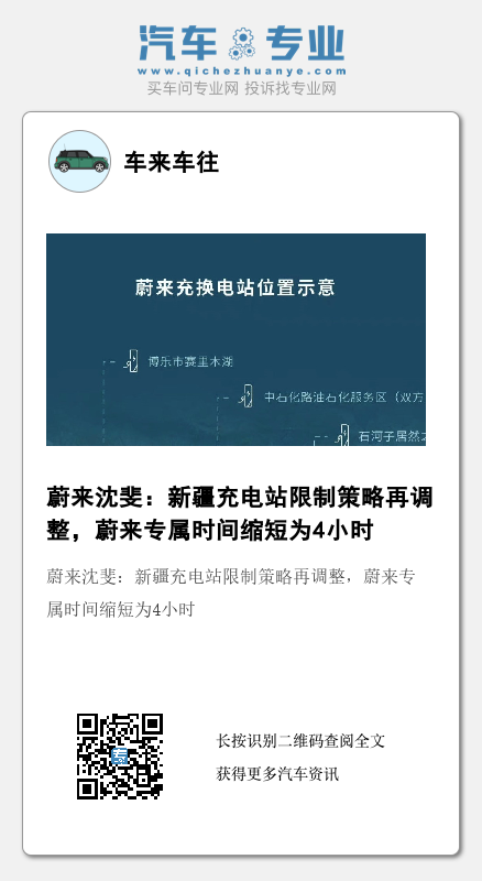 7月26日,蔚来能源高级副总裁沈斐在其社交平台上发文称,在考虑充电效率后,再次调整蔚来在新疆地区的充电站限制策略。调整后,蔚来专属时段为每日12:00-14:00、16:00-18:00,其余时间面向公共开放。