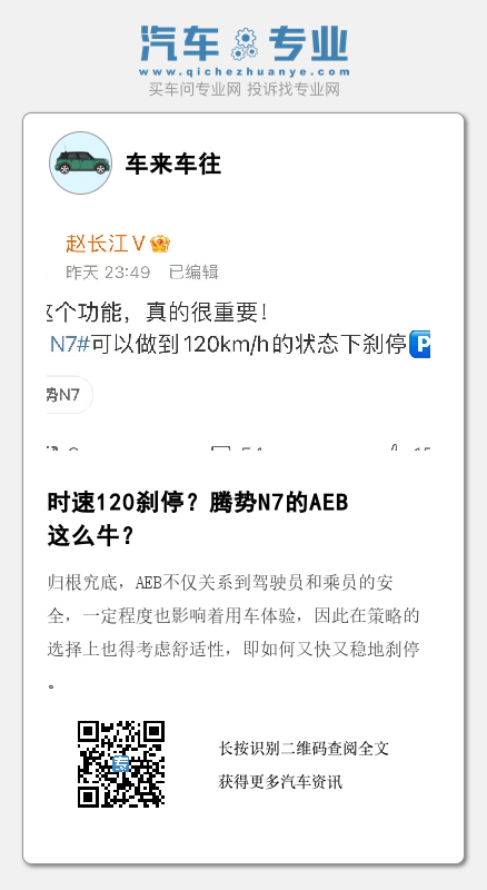 7月25日,腾势销售事业部总经理赵长江发文称,腾势N7的AEB功能可以做到在120km/h的状态下刹停。一时之间,引发热议。