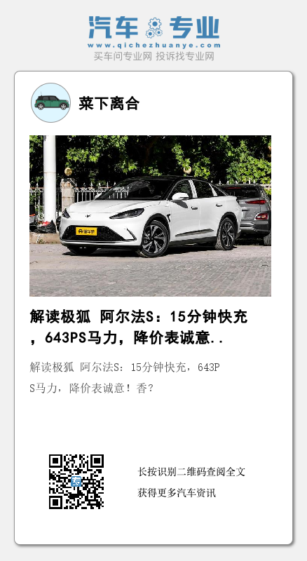 总结:新款极狐阿尔法S设计走向更加全面,除了针对智能化功能的填充之外,还在动力方面着重加强,显示数据甚至可以与部分性能车、跑车相媲美,实力提升幅度不容小觑。虽说官方指导价32.98万元稍高,目前经销商报价上也给出了较大幅度的优惠,但与其表现力相平衡,性价比也有了比较不错的表现,对此,大家有什么看法呢?