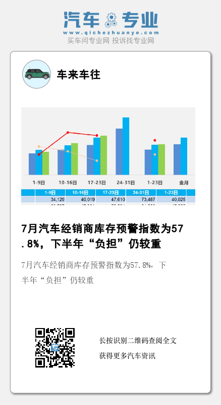 另从经销商库存预警分指数情况看,7月库存环比上升,市场需求、平均日销量、经营状况指数则呈环比下降状态。