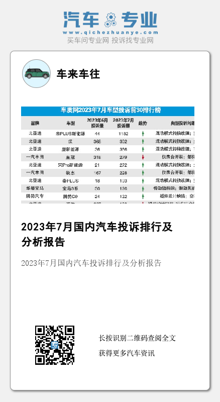 据国内领先的缺陷汽车产品信息收集平台车质网统计,2023年7月车质网共受理车主有效投诉信息18,225宗(其中含5宗针对第三方平台投诉,2宗后装轮胎投诉),创造了车质网成立以来的月投诉量最高纪录,环比上涨28%,同比上涨41.6%。今年1-7月累计投诉量达86,001宗,已接近2019年全年总投诉量。