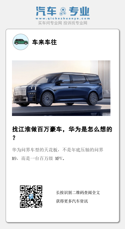所以从华为的角度来说,这款 MPV 更像是一个技术展示平台,是一款用来“秀肌肉”的产品,目的是提升问界在造车领域的品牌形象,而这场合作中的配角江淮,又有什么样的想法呢?