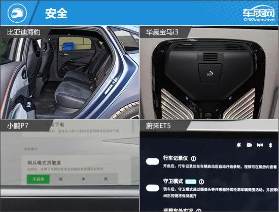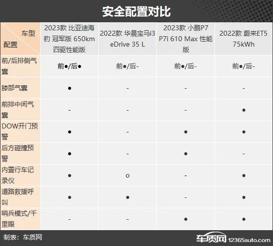 安全配置方面,四款车型在主/被动安全配置上均有细微差异。其中在被动安全配置方面,比亚迪海豹配备了后排侧气囊和膝部气囊,而蔚来ET5则配备了同级少见的前排中间气囊,两款车型对驾乘人员的安全更有保障一些。主动安全配置方面,宝马i3较其余三款车型表现稍差,不仅配置逊色,且内置行车记录仪还需选装。