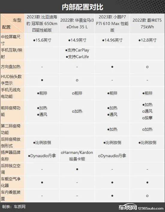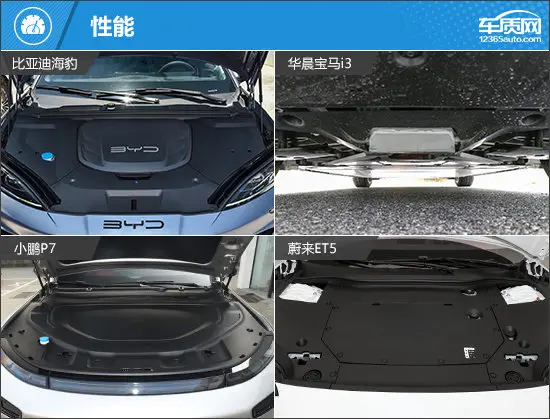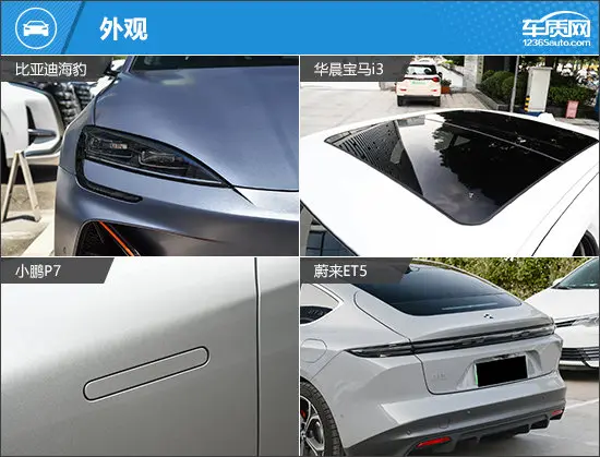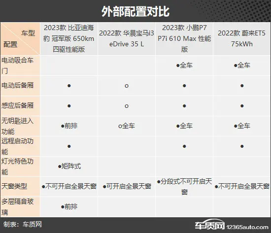 在外部配置方面,宝马i3作为传统豪华品牌车型,配置表现属实拉胯,像电动后备厢、感应后备厢以及无钥匙进入等功能还要进行选装。其余三款车型在这方面则有着出色发挥,其中小鹏P7和蔚来ET5还提供了全车电动吸合车门配置,高级感十足。而比亚迪海豹则提供矩阵式头灯和前排双层隔音玻璃,同样具有高级感,只不过侧重点有所不同。