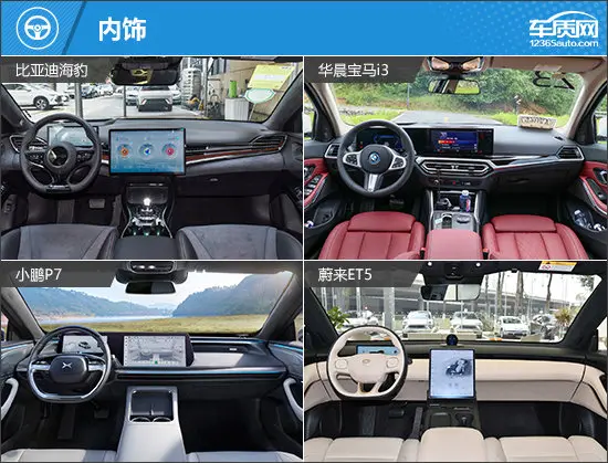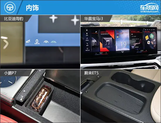 此外,宝马i3与小鹏P7一致,均采用仪表盘+中控屏相结合的方式;比亚迪海豹则与蔚来ET5一致,中控屏均为独立设计,不过比亚迪海豹中控屏还可支持旋转,科技感更足。