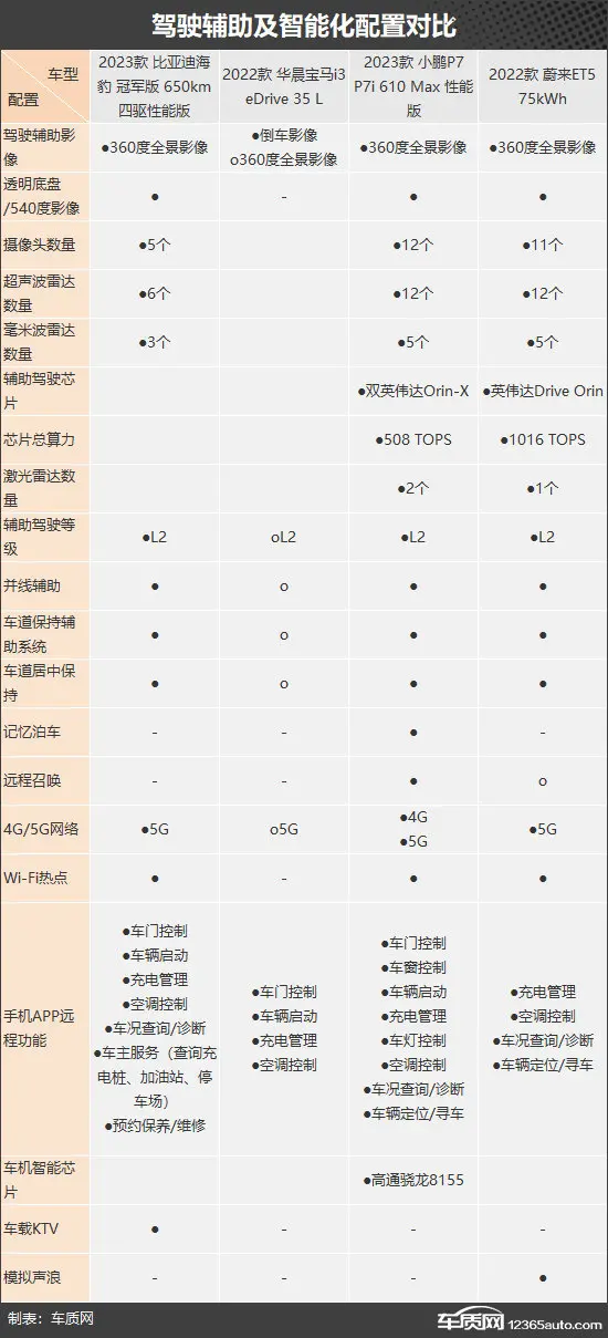 驾驶辅助系统方面,除宝马i3需选装L2级驾驶辅助系统外,其余三款车型均为标配。与此同时,小鹏P7和蔚来ET5作为造车新势力的第一梯队选手,在驾驶辅助系统硬件方面要优于比亚迪海豹,不仅摄像头、超声波雷达以及毫米波雷达数量较多,且还配备了激光雷达,算力也更强,因此驾驶辅助体验会更加出色。