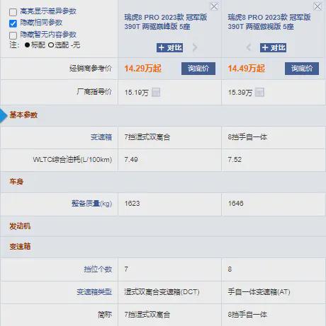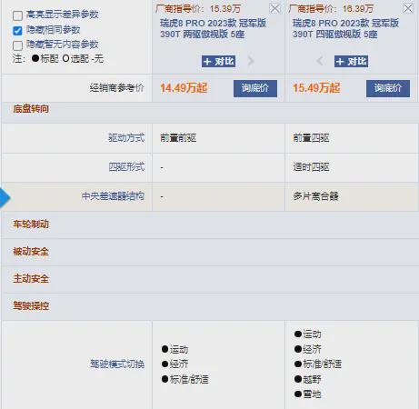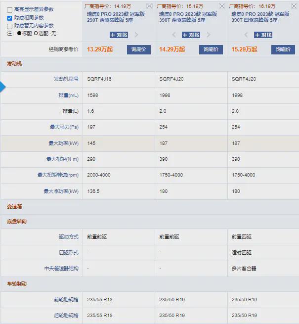 值得注意的是,瑞虎8 PRO冠军版的1.6TGDI动力水平,基本与同级竞品2.0T动力接近。选车君认为,如果你预算有限,基本在城市代步,对动力没有那么苛刻的要求,完全可选择1.6T动力车型。毕竟,以两驱巅峰版 5座车型为例,同时具备两款动力的车款,两者价格相差1万元。