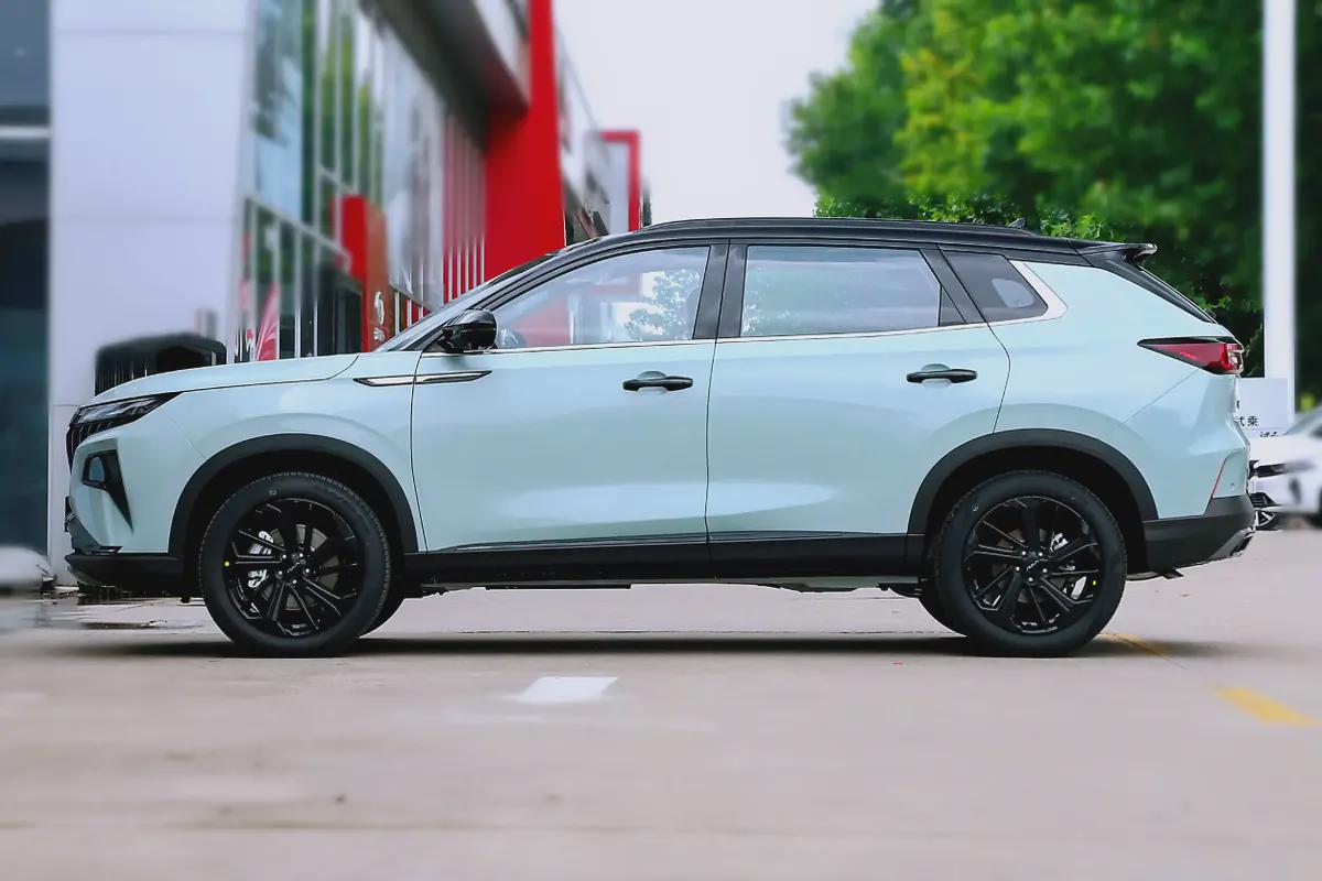 从侧面看,整个车身显得比较魁梧,非常有面子,车顶与车窗为黑色设计,车窗的面积较大,保障车内视觉开阔,轮眉与裙边均加装了黑色饰板,轮毂为多幅式设计,显得非常大方。