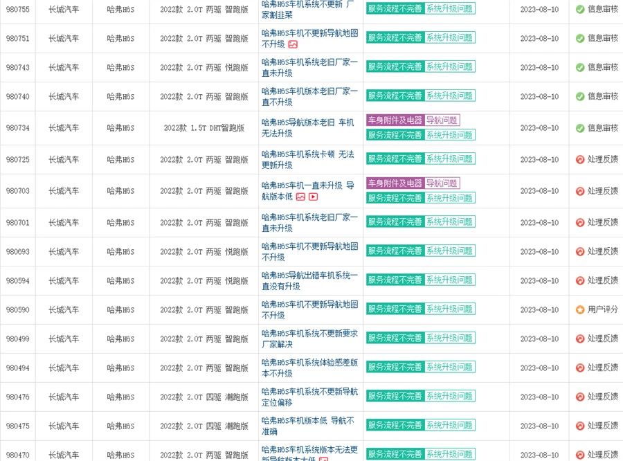“一直不升级,不能下载第三方软件,车机还是以前的老系统。”“车机没有升级过,出厂到现在,而且手机互联也没有,导航系统不更新,导航都出错。”······日前,在汽车投诉平台上,《汽车专业网》编辑注意到,在8月10日这天,有多位车主在车质网上集中投诉,称2022款长城哈弗H6S车机系统老旧厂家一直未升级。