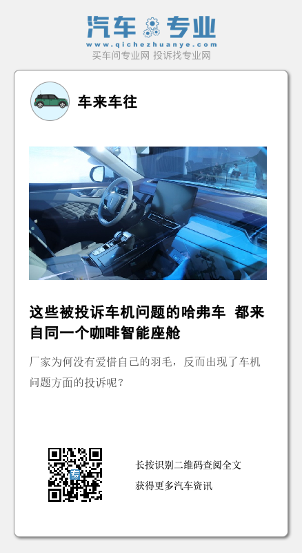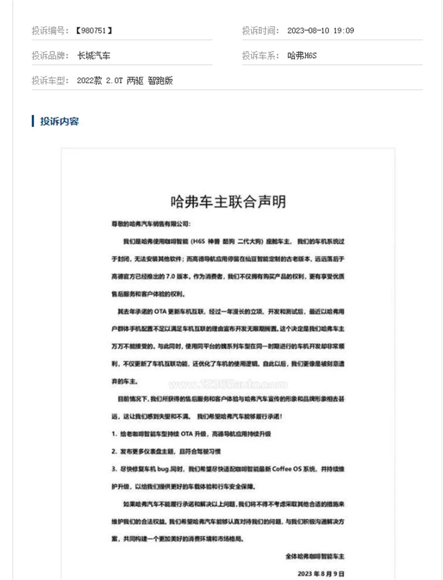 和其他车型投诉一样,密集投诉很像是车主商量好的一套维权“打法”。编辑发现,在8月10日2022款哈弗H6S被集中投诉的前一天,哈弗车主们发了一封联合声明,车主们称呼自己为哈弗使用咖啡智能(H6S神兽酷狗二代大狗)座舱车主,可见,车机拉胯这个问题不仅限于哈弗H6S的身上,《汽车专业网》此前报道的二代大狗也在内,同时还有神兽、酷狗的车主们也深受其害,这些车主们都有一个共同点,那就是使用了哈弗咖啡智能座舱。