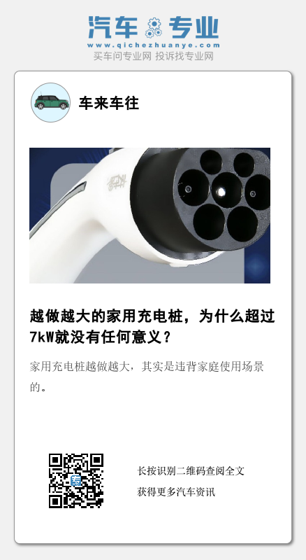 从实际层面考虑,家用充电桩基本不需要提升功率,7kW已经是一个不小的数据,匹配人的睡眠时间这已经足够快,20kW的家用充电桩,意义真的不是特别大。