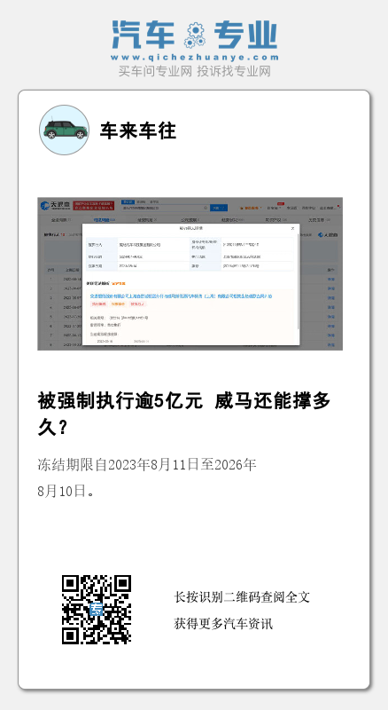 天眼查App显示,8月7日,威马汽车科技集团有限公司新增3条被执行人信息,执行标的总计7659万余元,执行法院为黄冈市黄州区人民法院、上海市青浦区人民法院。8月11日,威马汽车科技集团有限公司新增一则股权冻结信息,被冻结股权数额60亿人民币,股权被执行企业为湖北星晖新能源智能汽车有限公司,冻结期限自2023年8月11日至2026年8月10日。